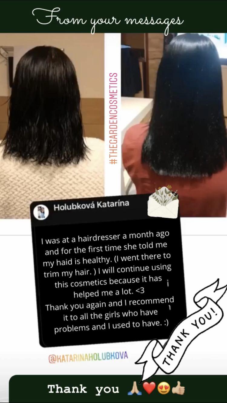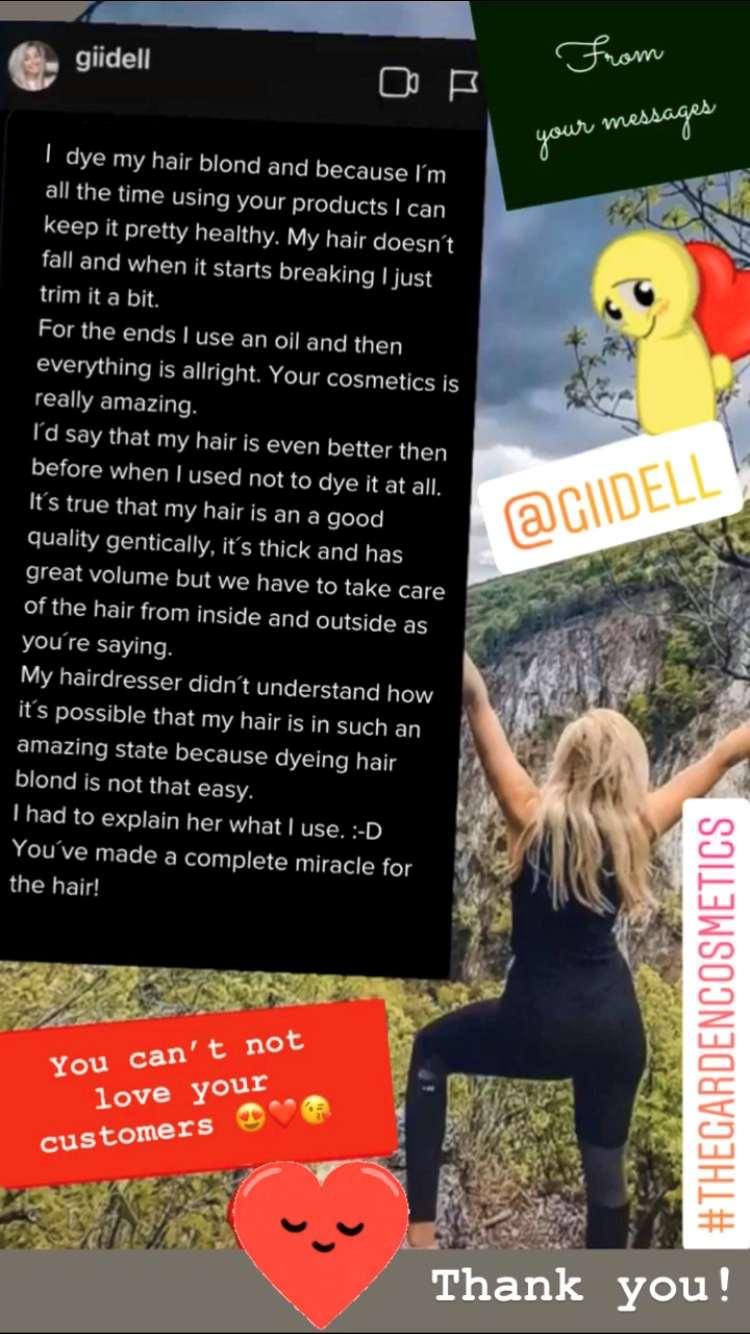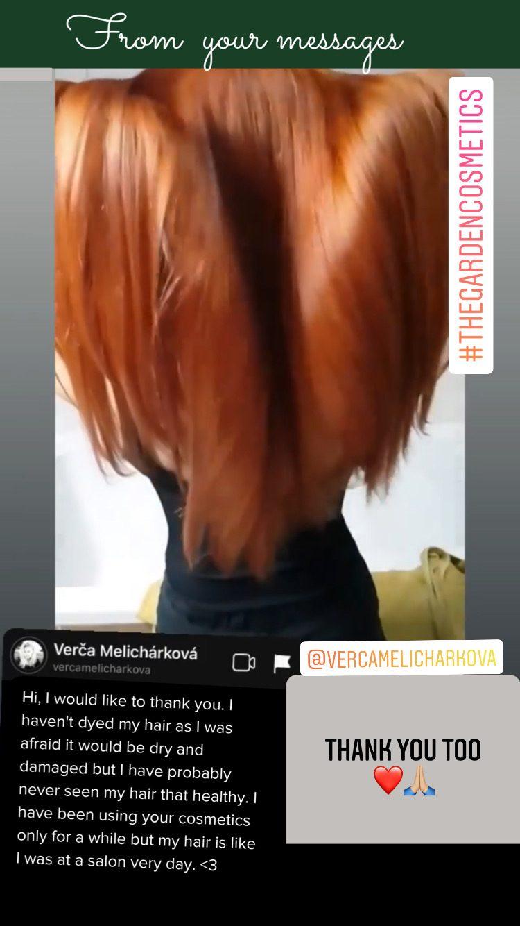 "I would like to thank you. I haven't dyed my hair as I was afraid it would be dry and damaged but I have probably never seen my hair that healthy. I have been using your cosmetics only for a while but my hair is like I was at a salon very day.❤️"