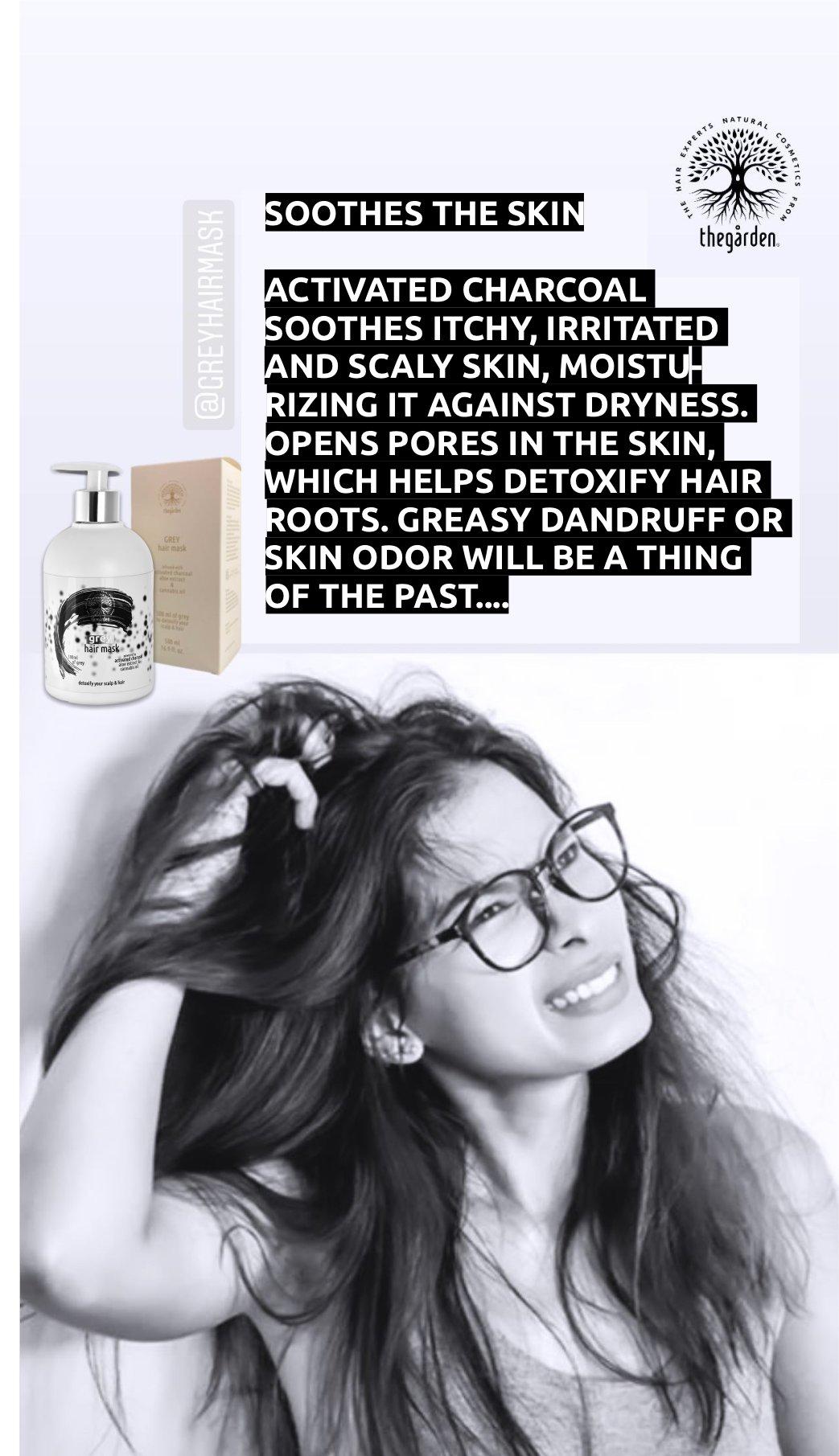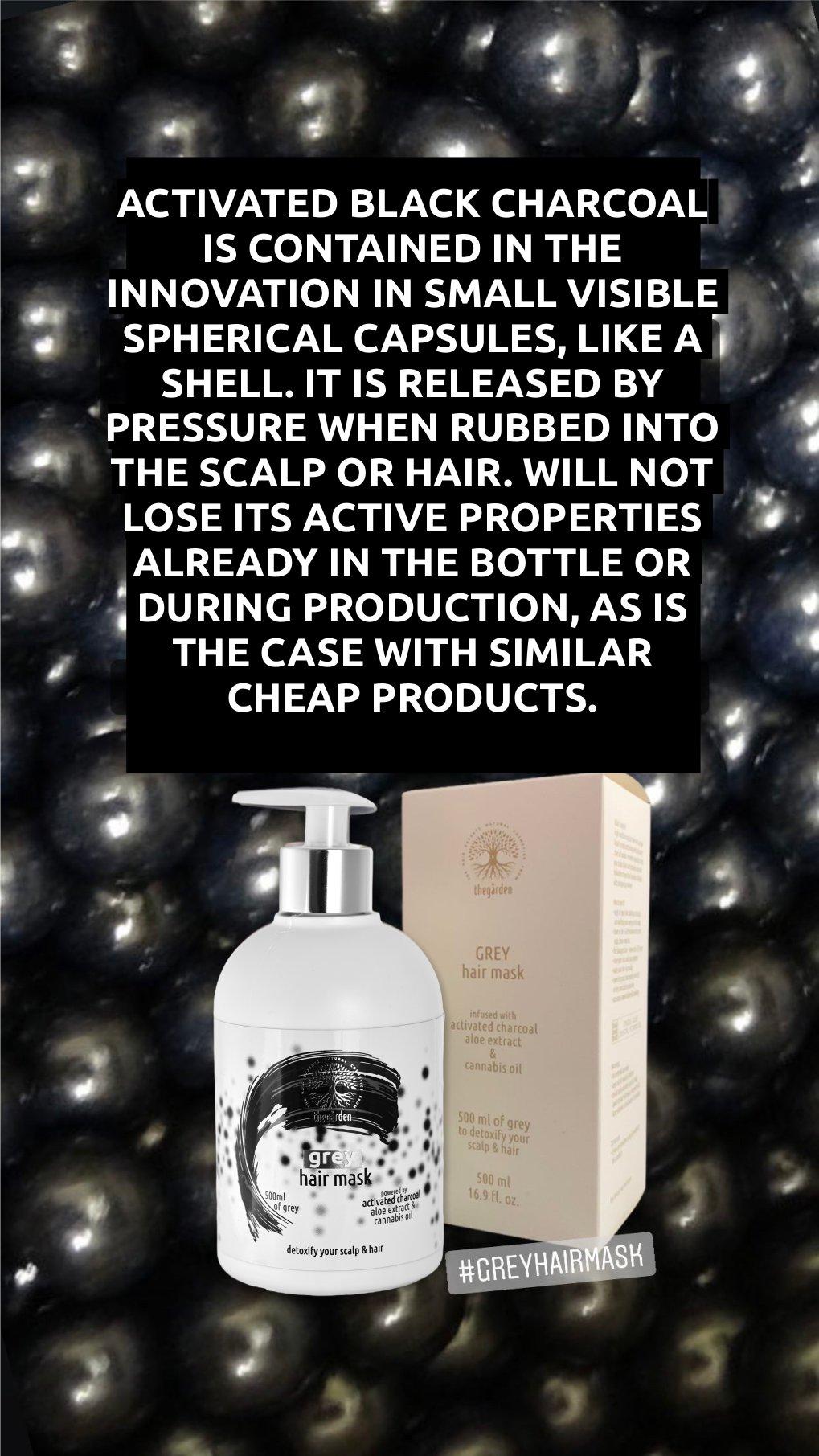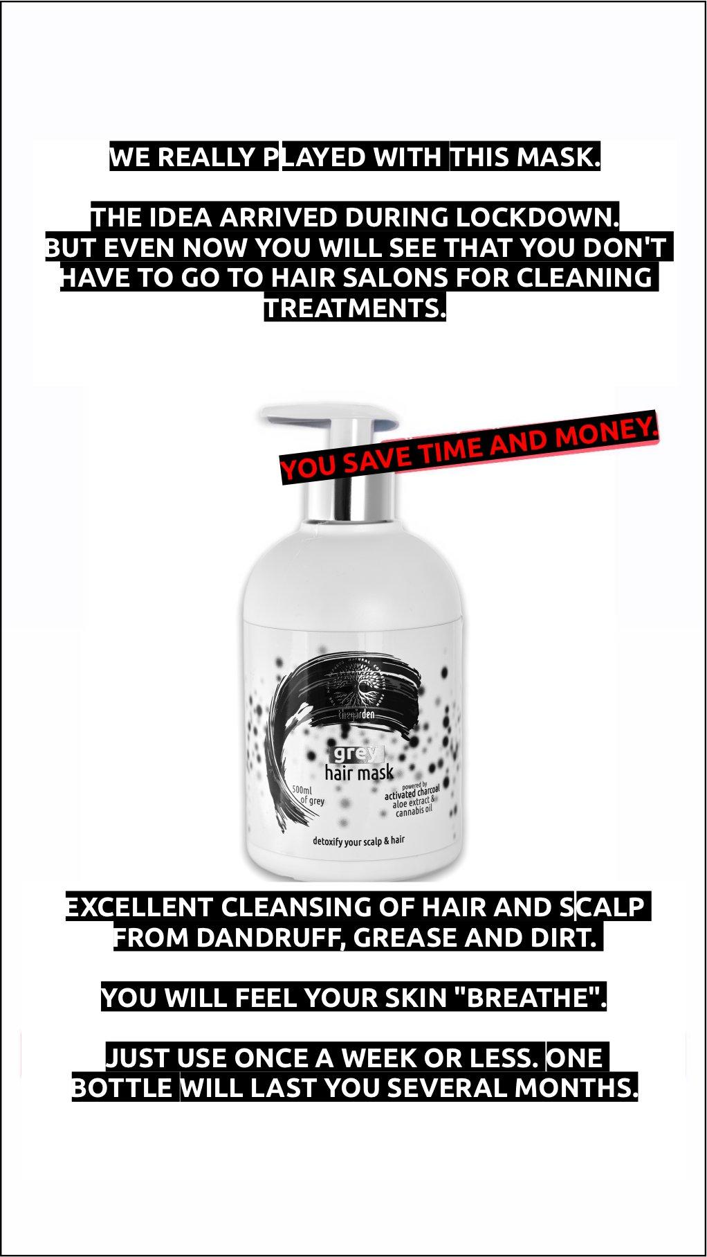 The first uses Grey Hair Mask, a pre-shampoo detoxifying hair and scalp treatment mask with encapsulated activated charcoal, aloe vera and hemp oil in a unique liquid crystal technology: